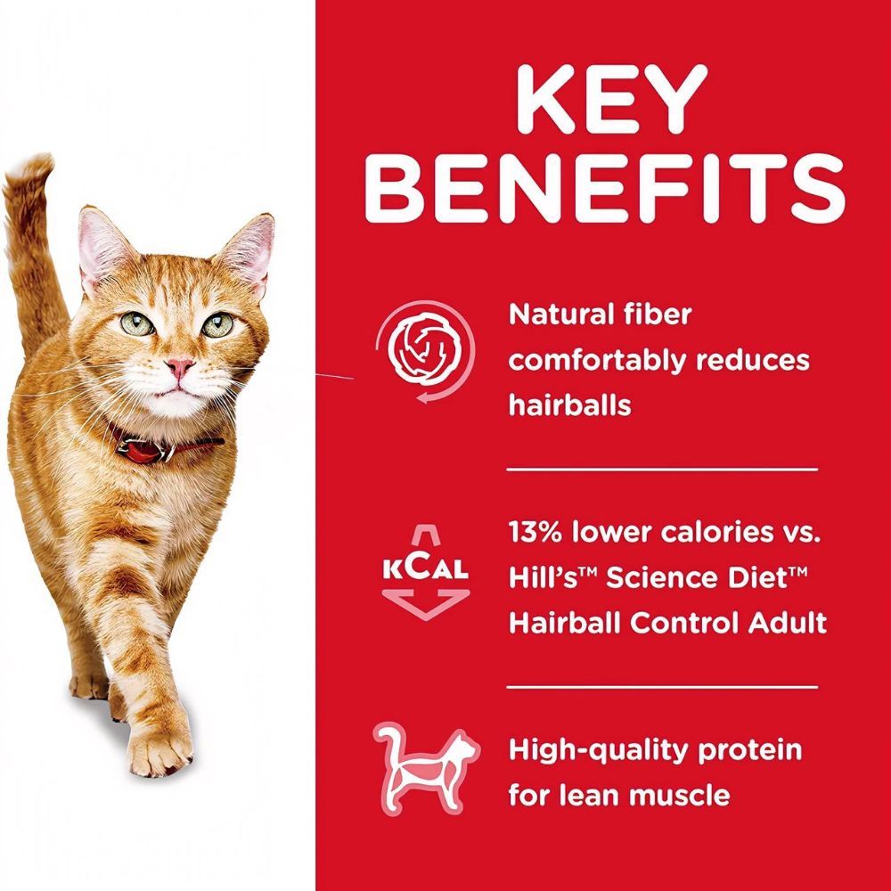 This dry kibble food is made with natural fibers to comfortably reduce hairballs and is low-cal, with 13% fewer calories than Hill's Science Diet Adult hairball control.