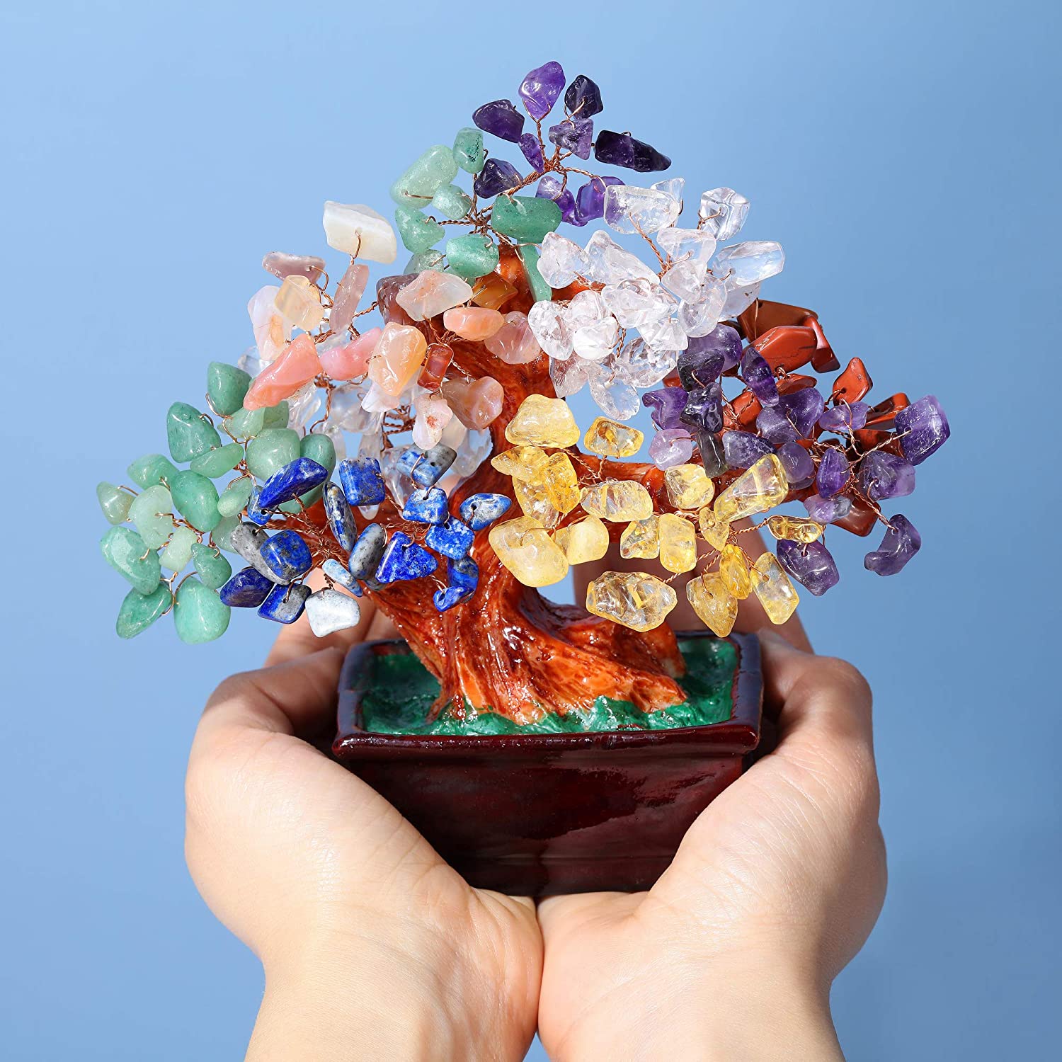 Jovivi Natural 7 Chakra Gemstone Crystal Tree Resin Base Bonsai Feng Shui decorations for prosperity and Luck, is a great way to bring positive energy and Feng Shui balance into your home. This beautiful Chakra Crystal Tree features 7 chakras with gemstones for each one and a resin base for a realistic look. The crystals and gemstones are said to enhance healing energies and focus energies in positive ways. Plus, the gemstones are incredibly powerful and protective, with high spiritual vibration that can guard against psychic attack.