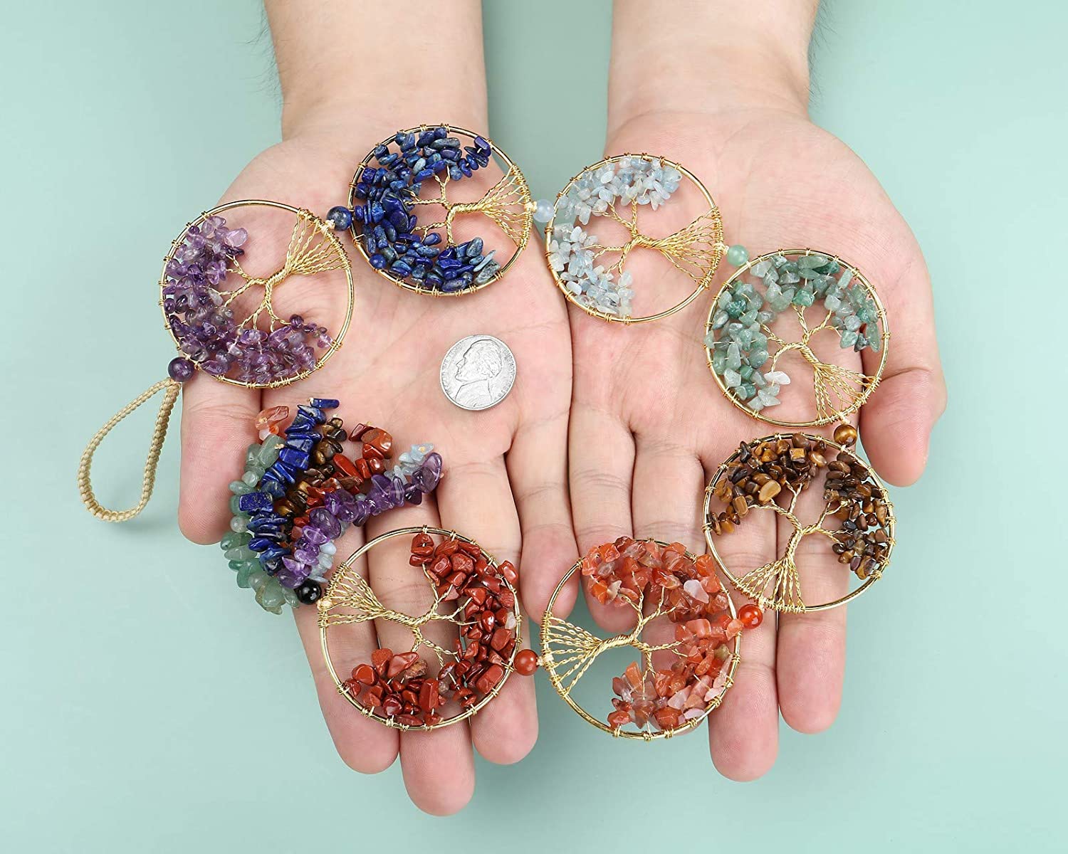 Top Plaza 7 Chakra Stones Healing Crystals Tree of Life Wall Hanging Decoration is an amazing way to bring happiness and positive protective energy into your home. This gemstones ornament is made with seven chakra stones including Amethyst, Aquamarine, Green Aventurine, Red Agate, Yellow Tiger Eye Stone, Lapis Lazuli, Red Jasper. Its beautiful design and vibrant colors make this wall hanging a great addition to any home. Plus, it's said to help people calm and relaxed and to improve luck, bring success, and attract an abundance of goodness and prosperity.