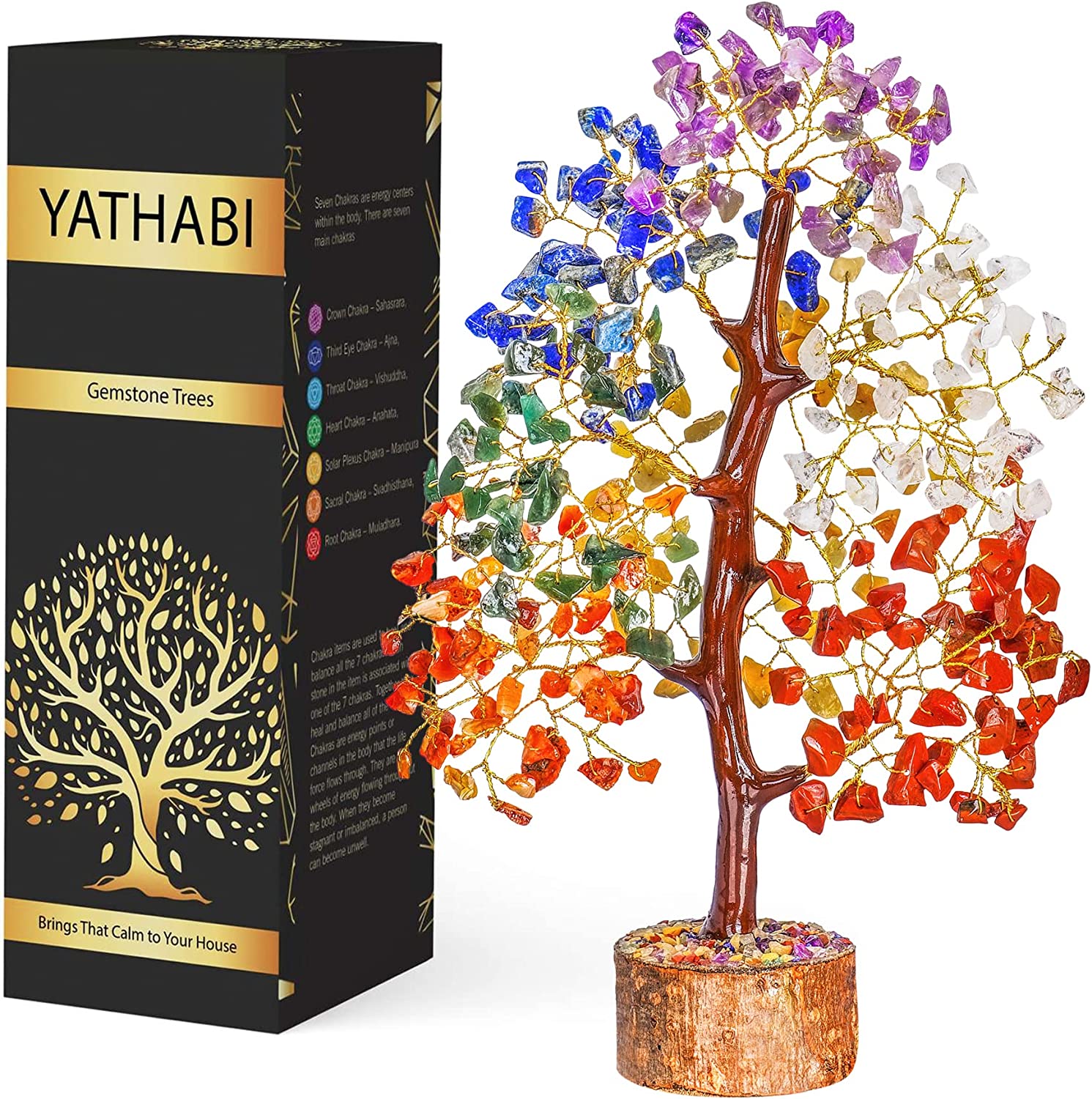 YATHABI – Chakra Crystal Tree of Life, Spiritual Tree is the perfect décor to bring balance and relaxed energy, Feng Shui is balance luck and wealth into your life. This beautiful and unique tree is handmade in India and is made up of a wooden base with a trunk made of m-seal, flexible golden wire and gemstone beads. Each crystal is said to bring wealth, prosperity and good luck and will enhance the crystal energies in positive ways.