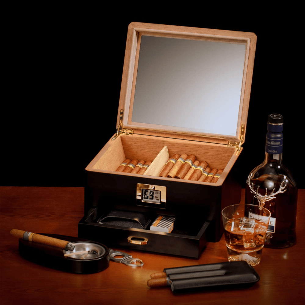 It can hold up to 50 cigars in various ring sizes and comes with a felt-lined bottom and tempered glass top to protect against accidental impacts.