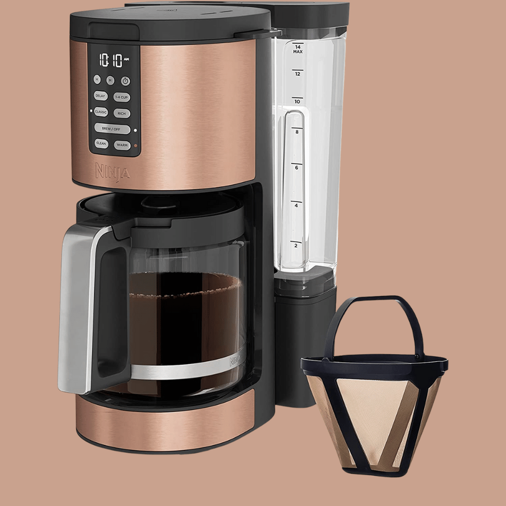 The Ninja Copper Coffee Maker has an incredibly compact design to fit in any kitchen and comes with a reusable permanent filter.