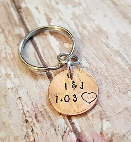 This unique and meaningful keychain features a hand stamped initials, name, and date with a heart around the date. Plus, all coins used in this product are real, adding a unique and personal touch.