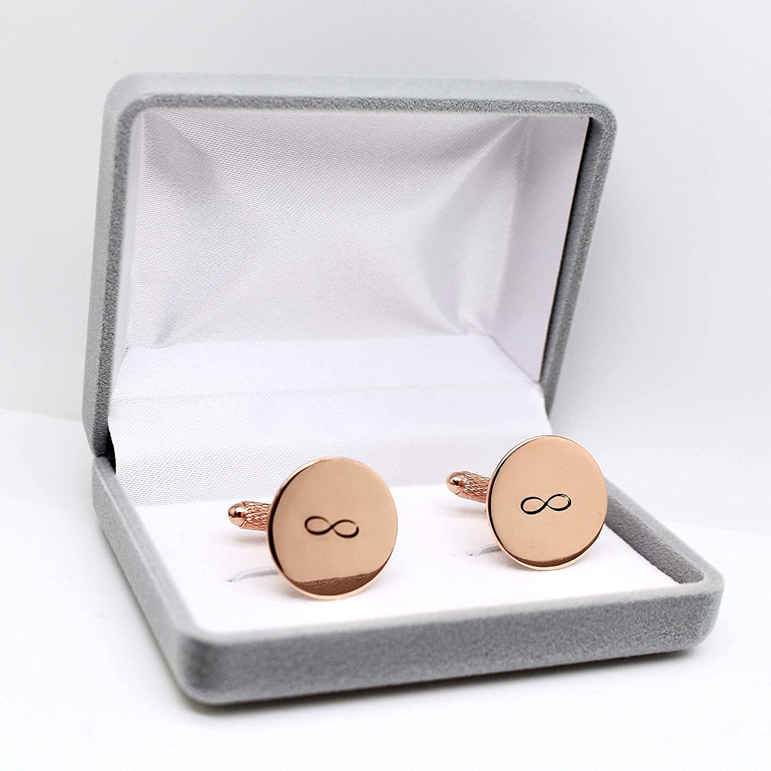These cufflinks are made of solid copper, bronze, rose gold filled or .925 sterling silver and boast a brushed or polished finish. They are engraved with an infinity symbol, date, or initials on the front and can be personalized with up to 18 characters on the back.