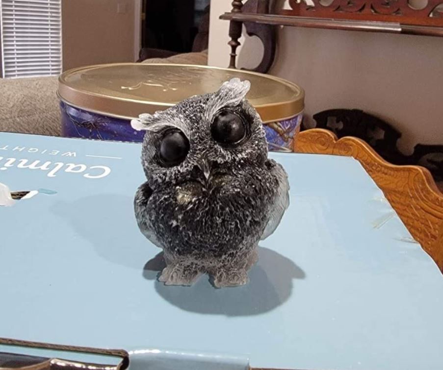 The OwMell Black Obsidian Owl Statue is a creative and unique piece of art. It's handmade with clear owl shape resin and filled with natural gemstones that can be seen through the bottom of the statue. Made of 100% natural black obsidian chips and resin, this owl statue can bring positive energy and peace of mind.