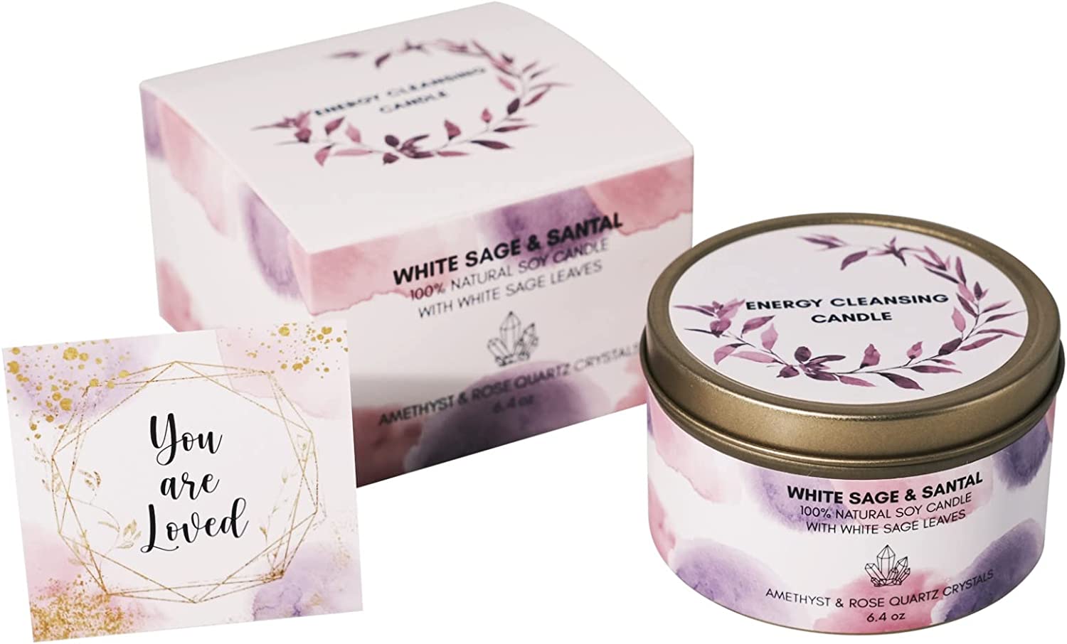 Picki Nicki -White Sage Smudge Candle with Rose Quartz and Amethyst Crystals is the perfect way to cleanse your chakras, home, and office while still enjoying the subtle scent of sage and lavender. This intention crystal candle is made of soy wax and has a 35-hour clean burn, making it a great choice for those who want to enjoy a longer-lasting aroma. Plus, the metal container encases the candle and is surrounded with rose quartz and amethyst crystals to help create a positive and calming aura.