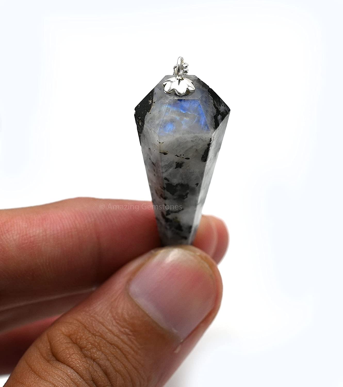 The Amazing Gemstone - Rainbow Moonstone Crystal Pendant Pendulum is a powerful tool for unlocking inner wisdom and gaining insight into the future. It works by harnessing of crystals, amplifying your intuition and helping you to make decisions with confidence. Its faceted hexagonal sides form a pointed cone that is perfect for divination, and its clear quartz bead enhances Reiki ritual properties.