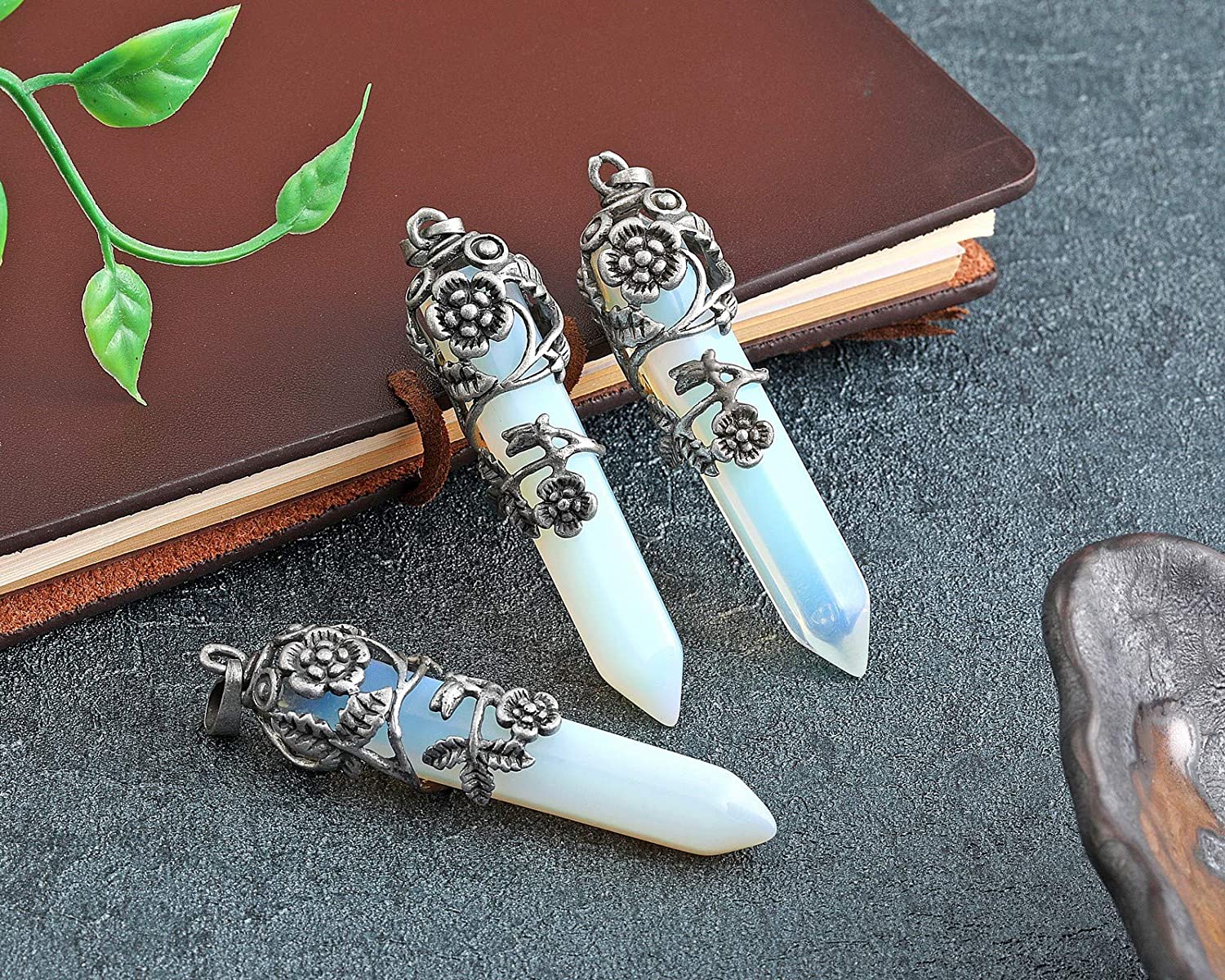 This Antique Silver Flower Wrapped Synthetic Opalite Healing Crystal is made of natural synthetic opalite with a copper or stainless steel chain. The pendant measures approximately 2.6 inches and the chain is 24 inches long. It comes with a grey velvet bag printed with the Top Plaza logo, making it a great gift for any occasion. The healing properties of this crystal make it a great choice for those looking for relief from depression and anxiety.