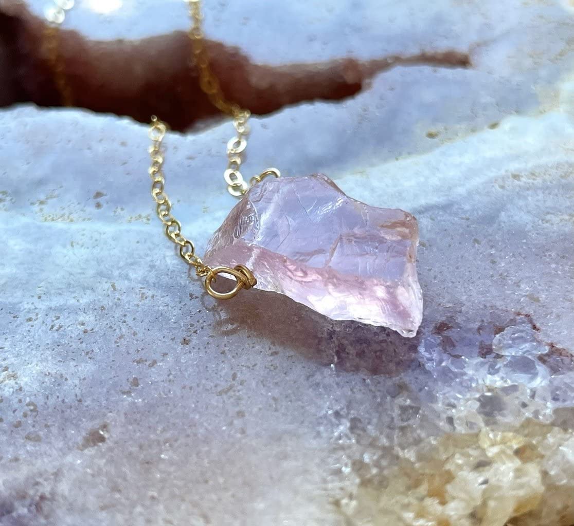Show your love with a beautiful raw rose quartz crystal necklace. This delicate but durable 14k gold-filled chain holds a stunning raw piece of rose quartz crystal, which emits loving and calming energy that speaks directly to your heart chakra. It's the perfect addition to any jewelry collection and will layer perfectly with other pieces.