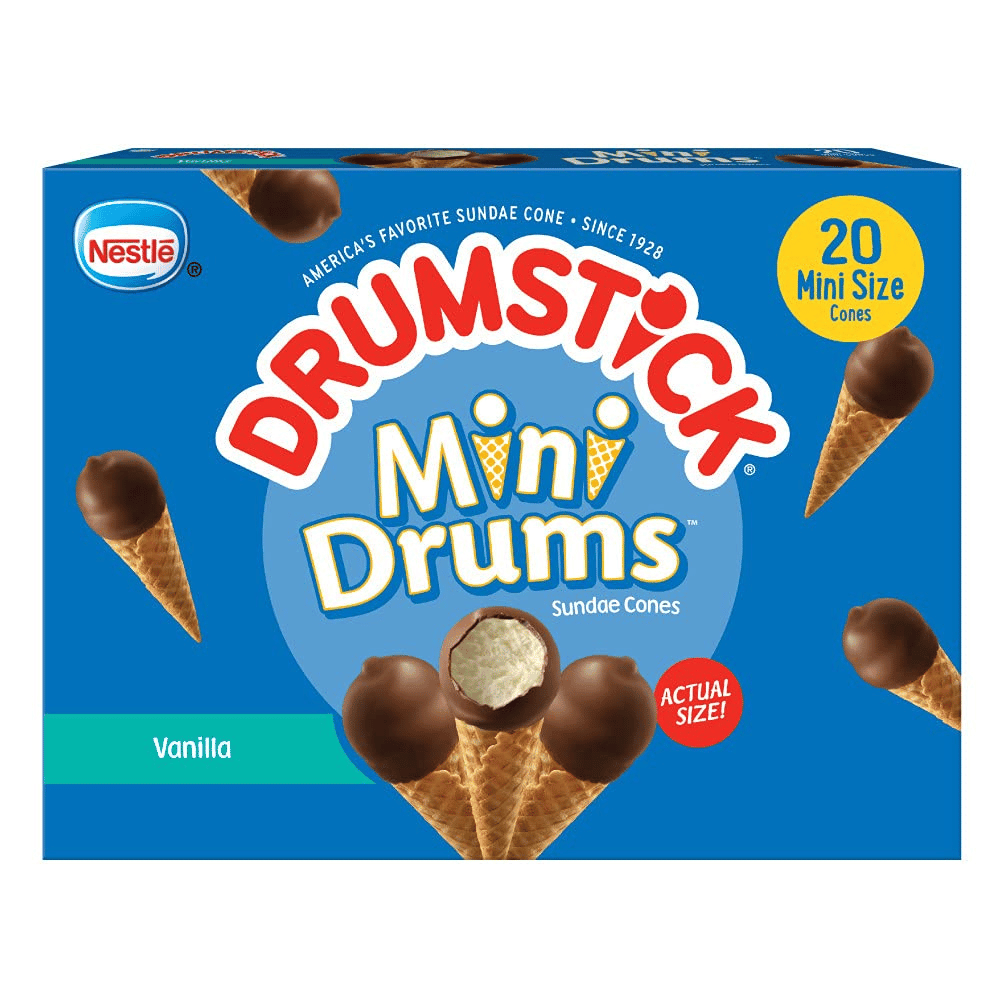 Drumstick is proud to bring you the original sundae cone, the Drumstick Mini Drums Vanilla ice cream cone. Guaranteed to satisfy your sweet tooth and win over the entire family, these little wrapped delights contain a unique blend of crunchy chocolate and luscious vanilla ice cream, all carefully tucked inside a crispy sugar cone.