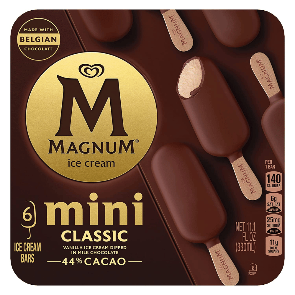Enjoy a luxurious treat with Magnum Classic Mini Ice Cream Bars. Indulge yourself with delicious Belgium Chocolate and 44% cacao, milk chocolate that coats creamy, rich vanilla ice cream. Every chocolatey coating-filled bite will fill your mouth with satisfaction.