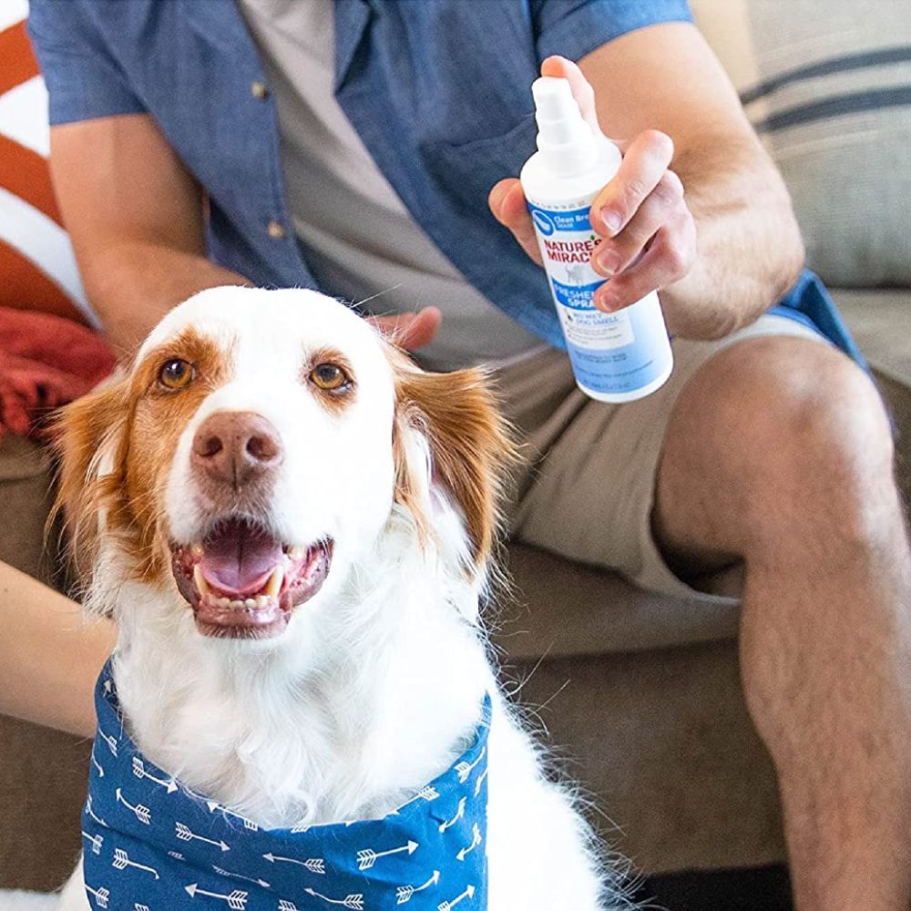 Nature’s Miracle Freshening Spray Clean Breeze Scent is a great way to help neutralize tough pet odors between baths.