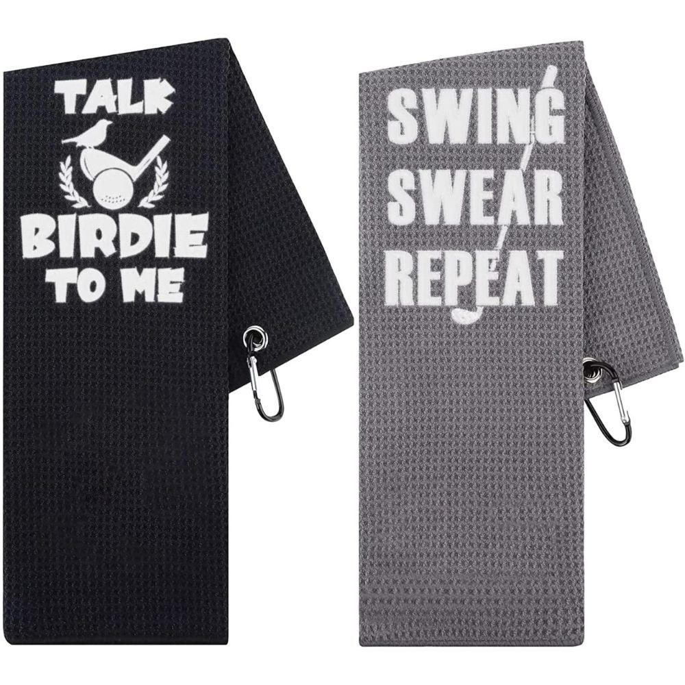 These funny golf custom design towels are the perfect size, and won't touch the ground when hanging. Plus, they are a great décor for your golf bag. With two different sayings, "Talk Birdie to Me" and "Swing Swear Repeat", you'll have everyone laughing with these funny joke golf towels.