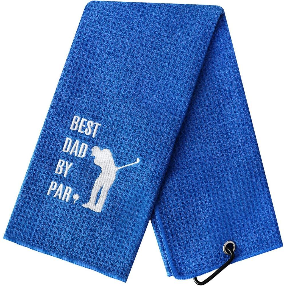 The towel is embroidered with the phrase "Best Dad By Par" in white thread, making it a cute and funny gift that will make your dad smile. The towel is also made of high-quality microfiber waffle fabric, making it soft and durable for cleaning.