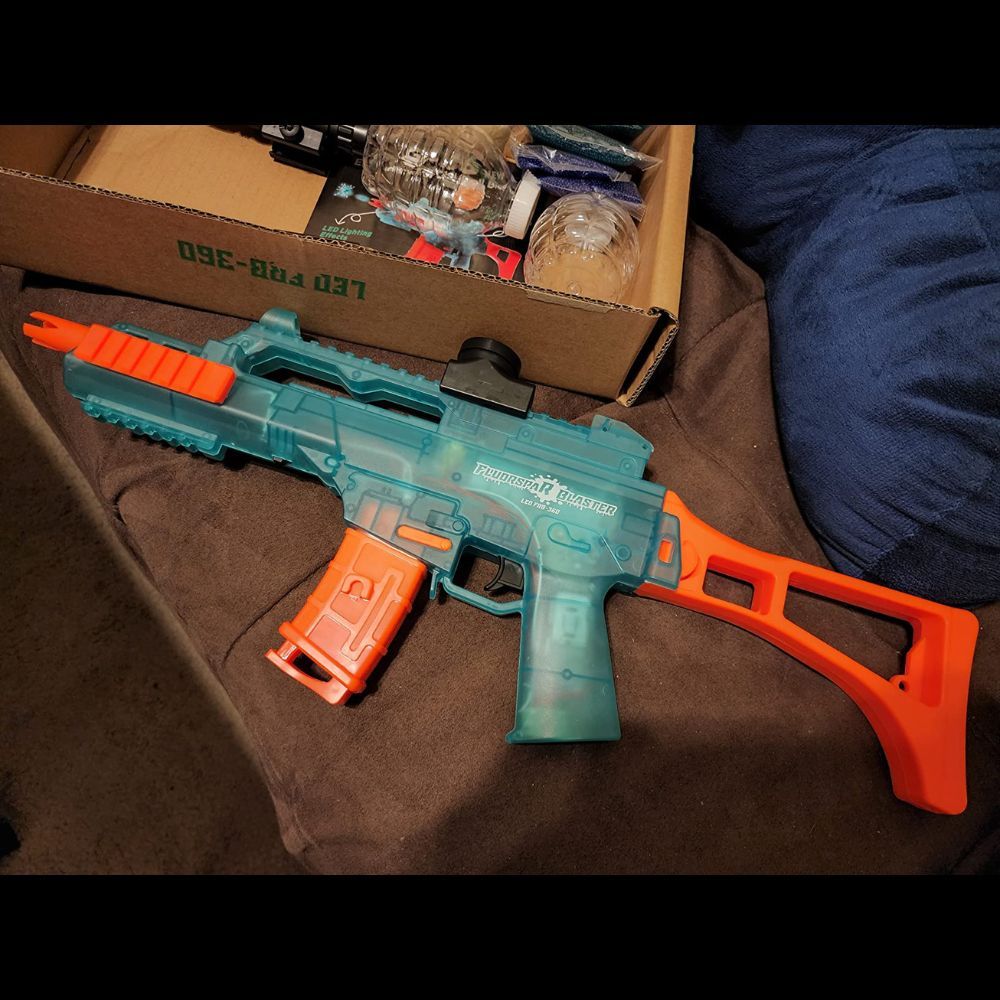 The Fluorspar Blaster is a fun and exciting toy for both kids and adults to play gellyball! With its glow in the dark, translucent design and fluorescent shell, this blaster is sure to impress. The 5 LED lights light up when you shoot, creating a mesmerizing visual effect.