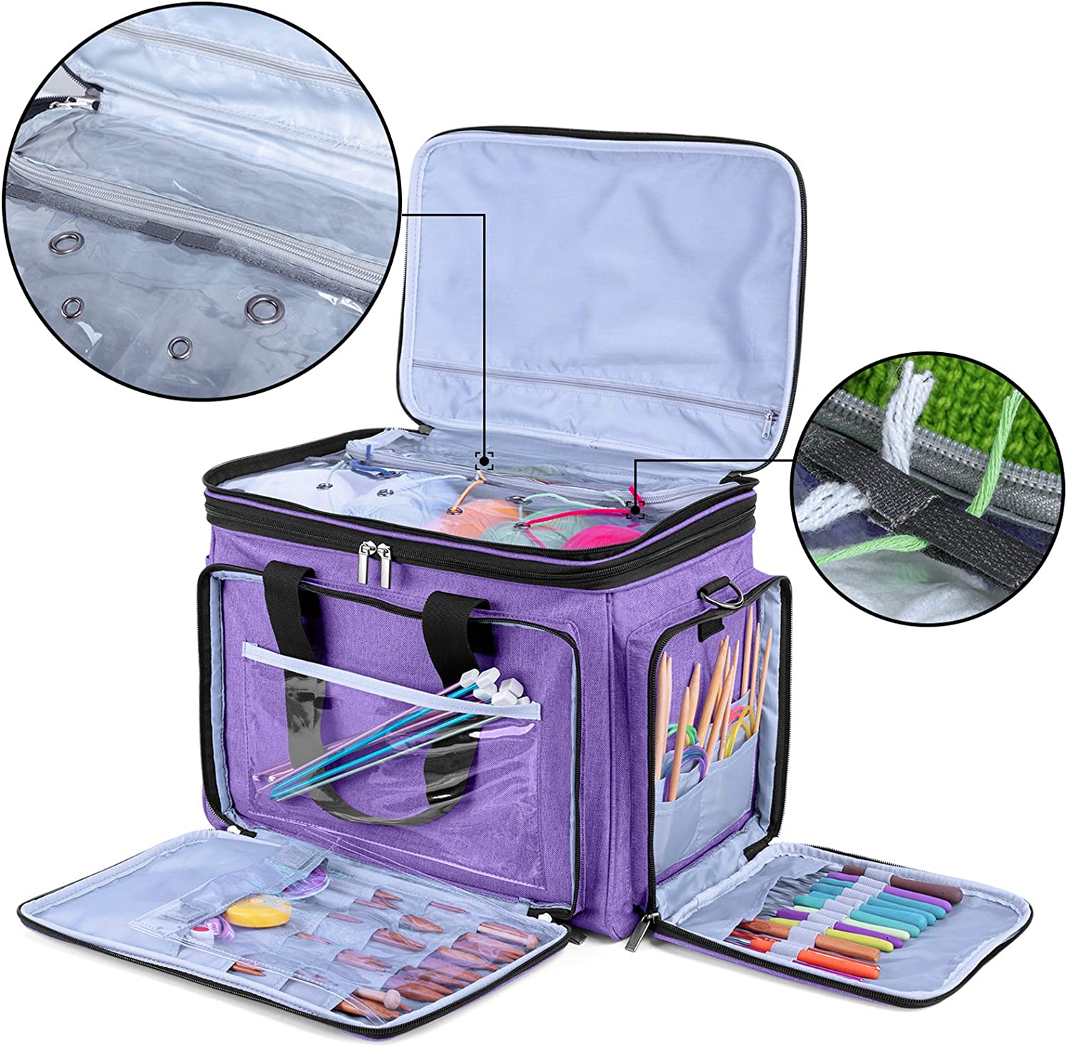 This knitting bag is not only functional but also stylish. It is made of heavy-duty nylon, making it more durable and scratch-resistant. It is also easy to carry, measuring 15" x 9.5" x 12" (L x W x H). It has a handle and a removable adjustable shoulder strap for portability. It also has 1 large transparent pocket for knitting or crocheting accessories, several slots for storing knitting needles (up to 14"), 1 side pocket with compartments for crochet hooks and circular needles, an open side pocket and a back pocket for other usage. This is the perfect gift for anyone that loves crocheting or knitting!