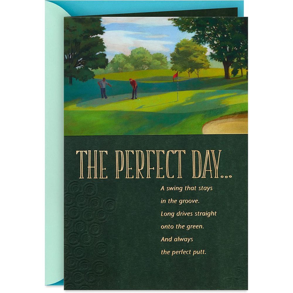 This birthday card features a painted golf scene and gold foil lettering that reads "The perfect day . . . A swing that stays in the groove. Long drives straight onto the green. And always the perfect putt." Inside it reads "Hope you have an incredible day and an even better year ahead. Happy birthday."