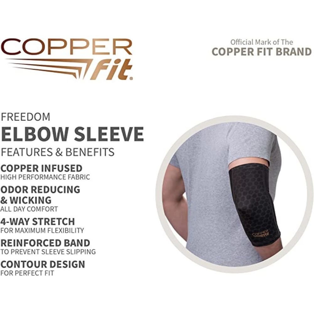 The Copper Fit Freedom Elbow Compression Sleeve is designed to provide comfortable support for muscle and joint stiffness and soreness.
