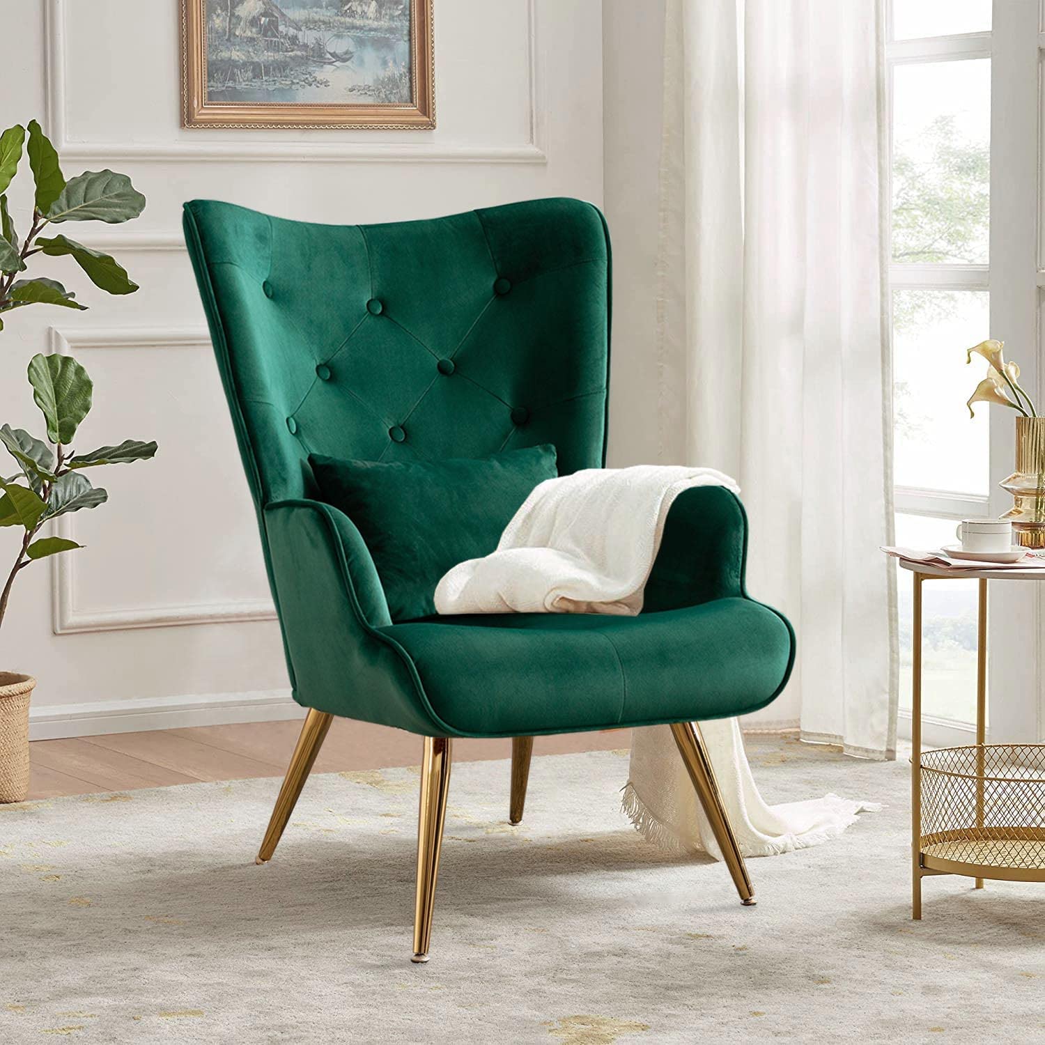 Altrobene Velvet Accent Arm Chair is the perfect addition to any living space. This lounge chair is designed with contemporary luxury in mind, featuring a stylish button tufted detail with silky velvet fabric. Its durable metal frame and sturdy flayed metal legs with a bold gold finish will confidently hold users up to 250LB. Additionally, the ergonomic huggy wingback design with upholstered expertly premium velvet fabric and tight seat filled with high density foam around frame and back make it a comfortable seating option that can be used in multiple applications including bedrooms, living rooms, waiting rooms, lobbies, and reception areas.