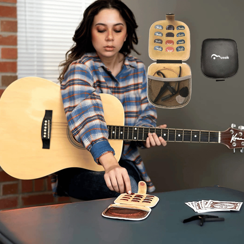 The Musak Guitar Pick Holder Case is made with high quality PU leather and felt for a smooth and comfortable feel. It also has a magnetic closure and metal ring that can be used to attach it to a guitar case or backpack. Plus, it's small enough to fit into a purse, backpack, or large back pocket. So, if you're a traveling guitarist, the Musak Guitar Pick Holder Case is the perfect accessory for you!