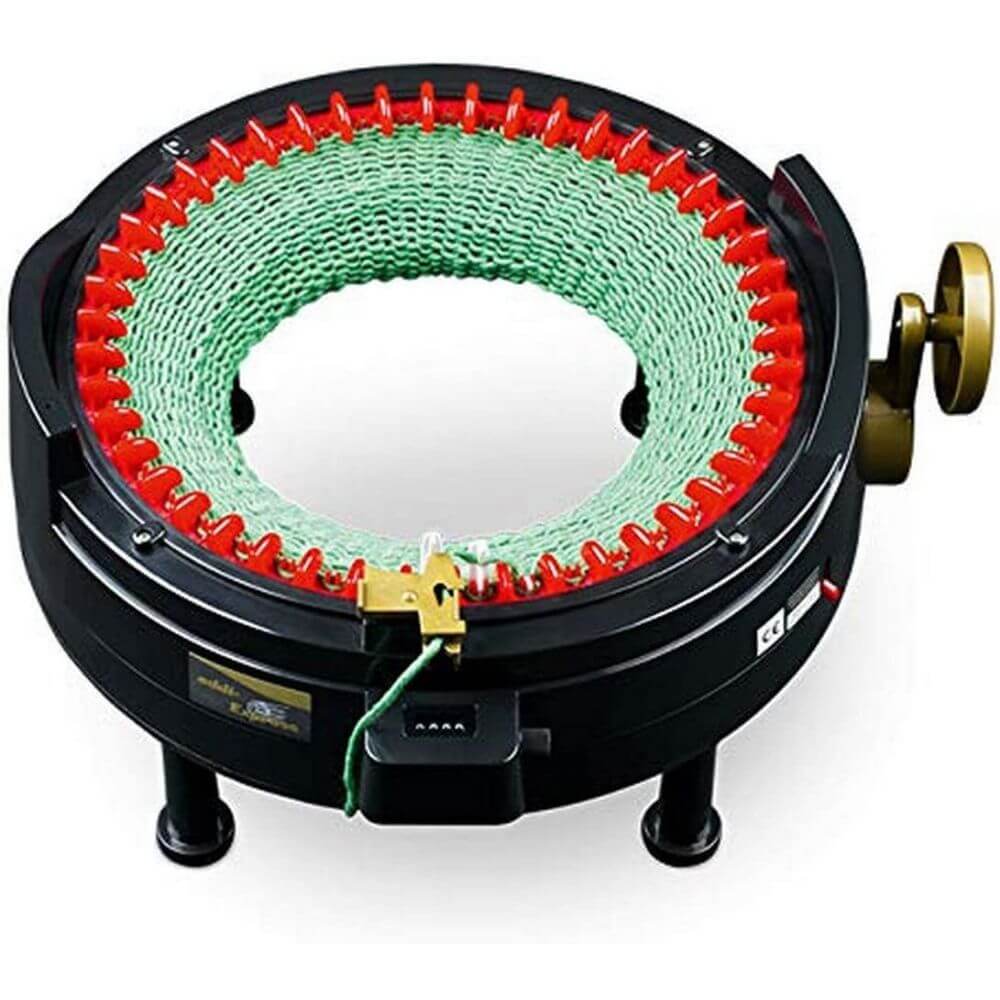 The addi-Express Professional was designed with 22 needles and can knit circular items from 10 to 15 cm (4" to 6") and plain knitted items from 15 to 20 cm (6" to 8") wide.
