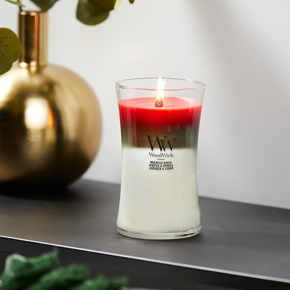 WoodWick Large Scented Candles Hourglass-Winter Garland Trilogy is perfect for any cozy and relaxing atmosphere.