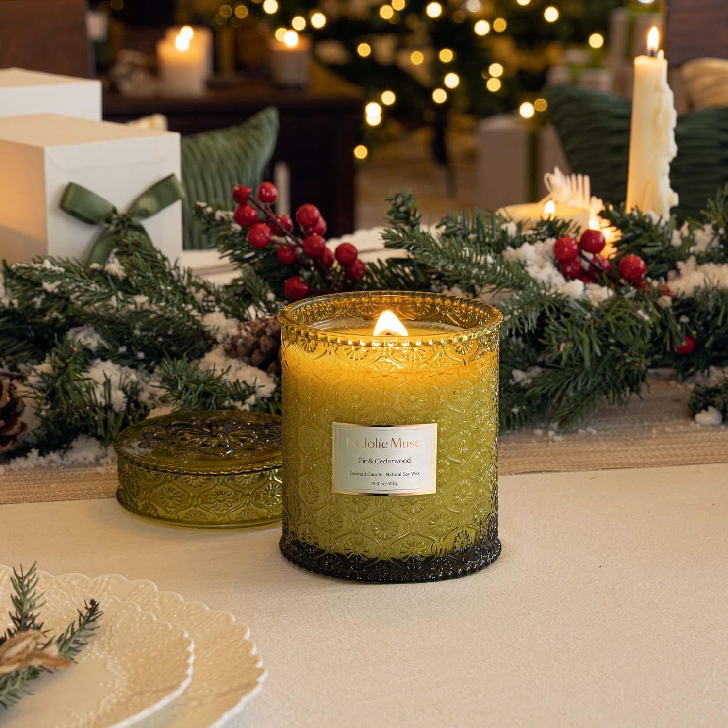 The La Jolie Muse Large Scented Candle in the Fir and Cedarwood scent is perfect for your Christmas home décor.