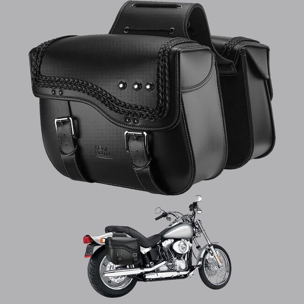 Kemimoto Motorcycle Saddlebags are perfect for any rider looking to add a little extra storage space to their ride. Made from durable synthetic leather, these black bags with white stitching are stylish and eye-catching.
