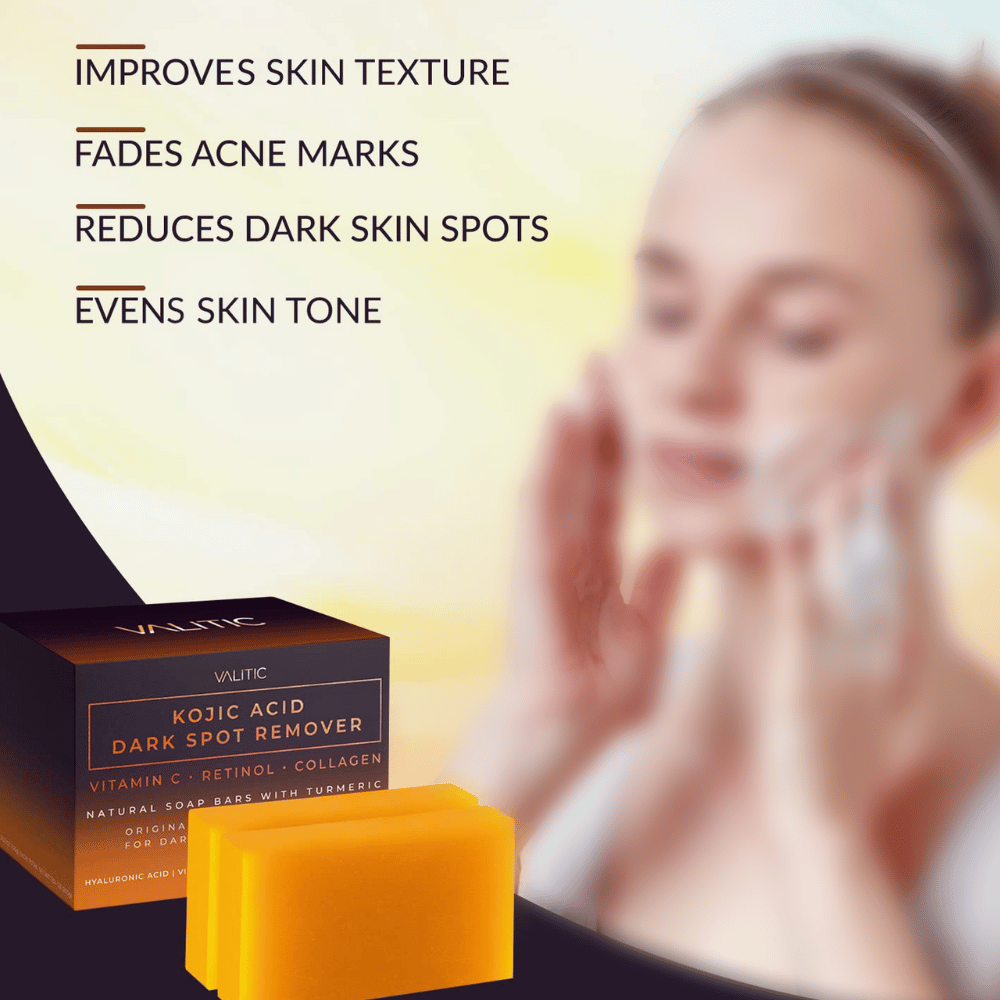 Valitic Kojic Acid Dark Spot Remover Soap Bars also contain Vitamin C, Retinol, and Collagen which help to keep the skin hydrated and reduce sun damage, dark spots, and blemishes. Additionally, it contains Turmeric which helps to restore moisture balance and revive the skin from sunburns, fine lines, and wrinkles. This soap is perfect for men looking to reduce scarring and acne breakouts and get a smooth, glowing complexion.