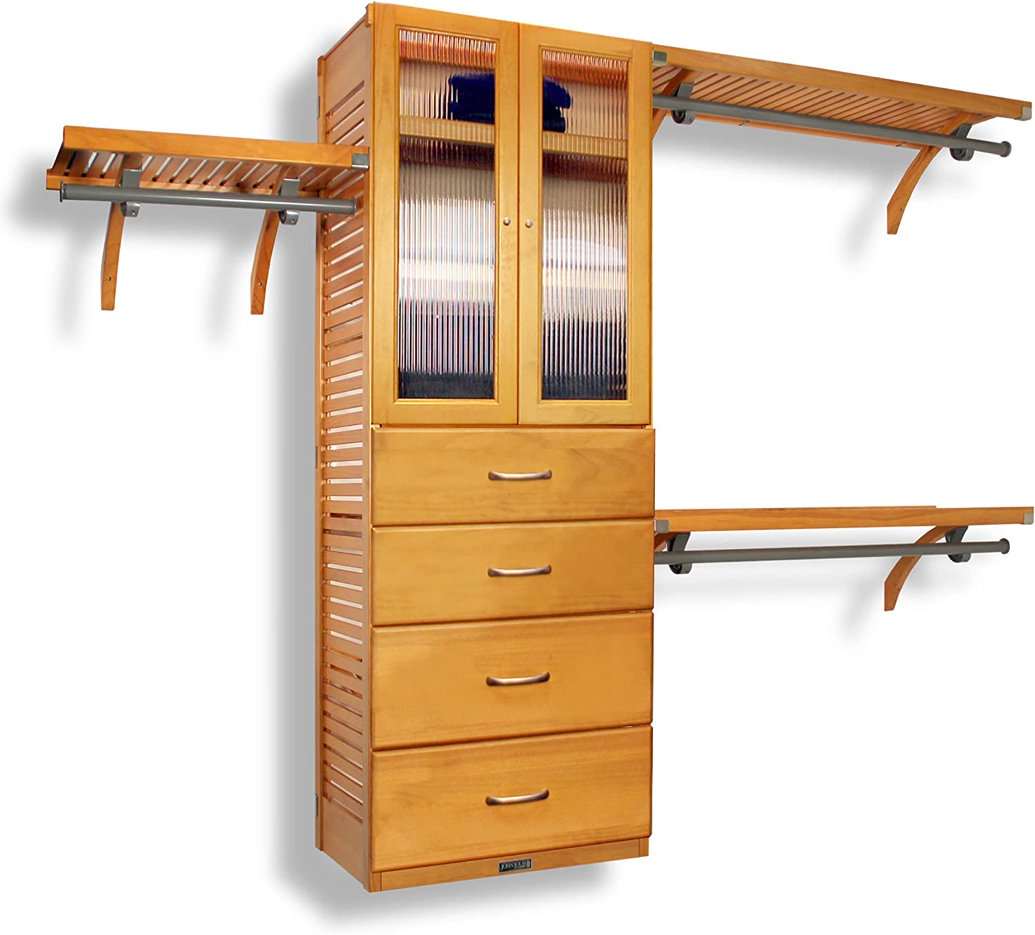 Bring style and storage to your kitchen with the maple kitchen cabinets from XYZ. Crafted of solid maple with a 16 Inch shelf depth, this set of cabinets is ideal for organizing any kitchen, closet, pantry, linen, bathroom, or laundry space. The set includes a 6ft accessory tower and two 8in. deep drawers and two 10in. deep drawers. The drawers are also equipped with soft close full extension glides, ball bearing draws, and satin nickel drawer handles with a felt-lined bottom. The set also includes a set of tower doors with removable fluted glass, concealed pocket hinges, and soft close pocket hinges with a satin nickel handle.