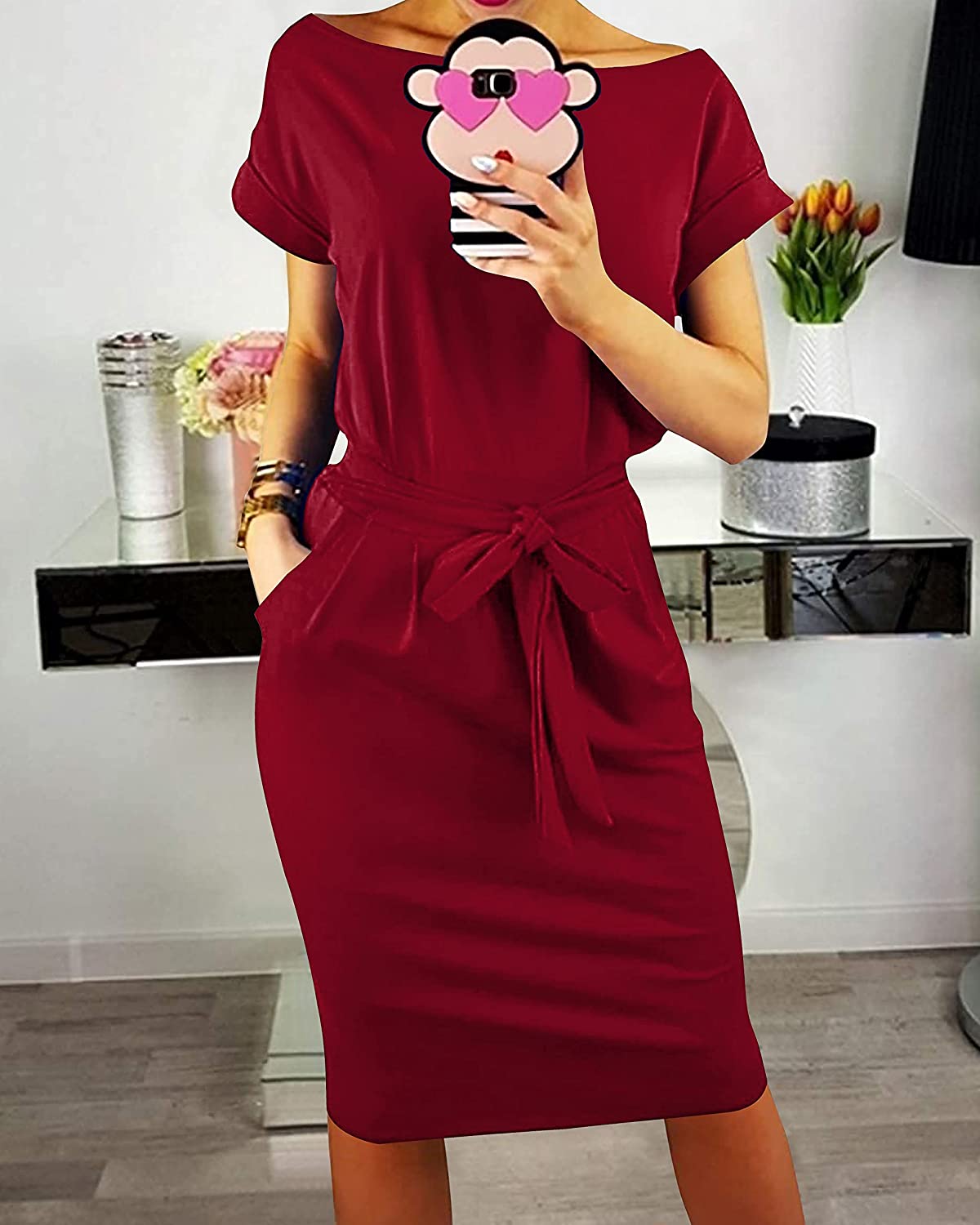 PRETTYGARDEN Women's Summer Short Sleeve Crewneck Striped Dress Basic Solid Tie Waist Office T-Shirt Dresses Pockets