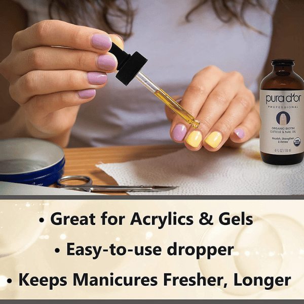 PURA D'OR Organic Nail and Cuticle Oil is the perfect solution for anyone looking to nourish and strengthen their fingernails and toenails. This certified USDA organic oil is formulated with a blend of biotin, sunflower oil, honey, jojoba, almond milk, and vitamin E to help cracked dry nails recover and promote strong new growth. It's also safe for use with acrylic nails and helps keep manicures fresh and cuticles moisturized.