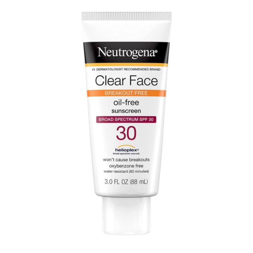 2. Neutrogena Clear Face Liquid Sunscreen for Acne-Prone Skin, Broad Spectrum SPF 30 Sunscreen Lotion with Helioplex, Oxybenzone-Free, Oil-Free, Fragrance-Free; Non-Comedogenic