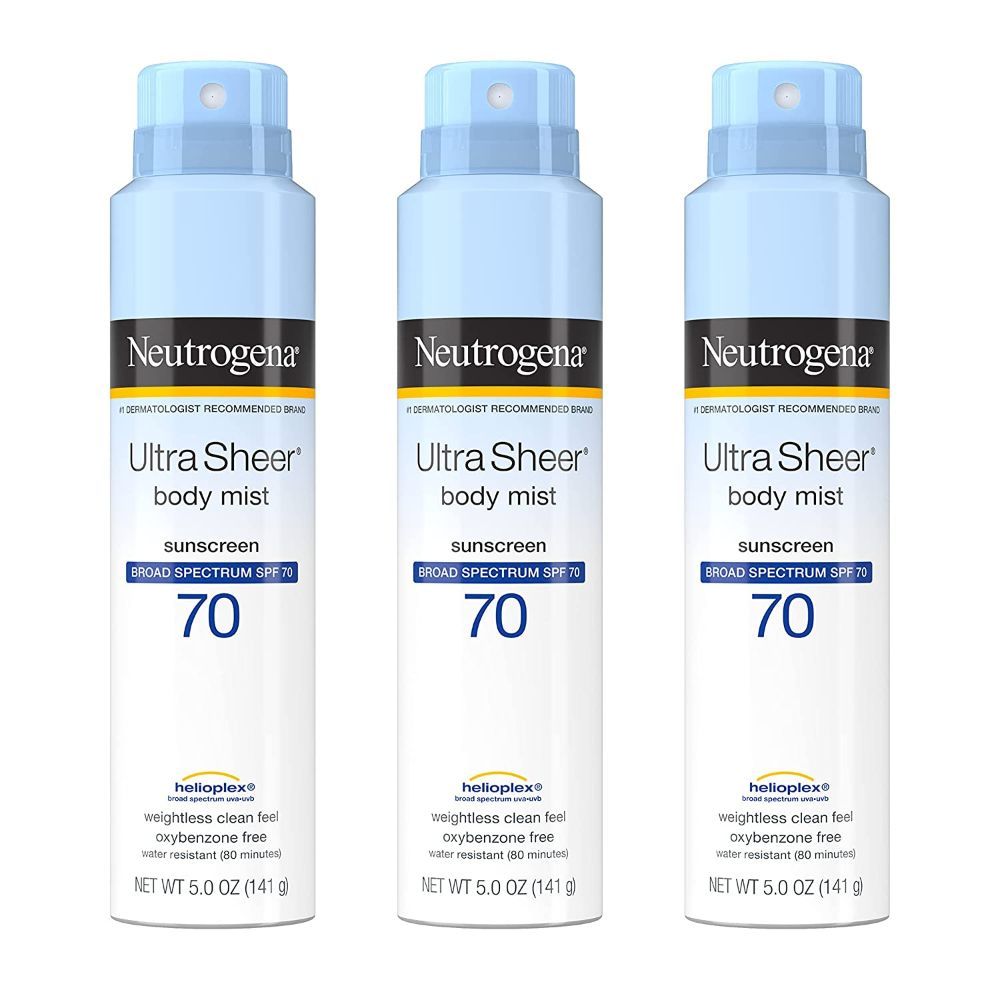 8. Neutrogena Ultra Sheer Body Mist Sunscreen Spray Broad Spectrum SPF 70, Lightweight, Non-Greasy & Water Resistant, Oil-Free & Non-Comedogenic UVA/UVB Sunscreen Mist