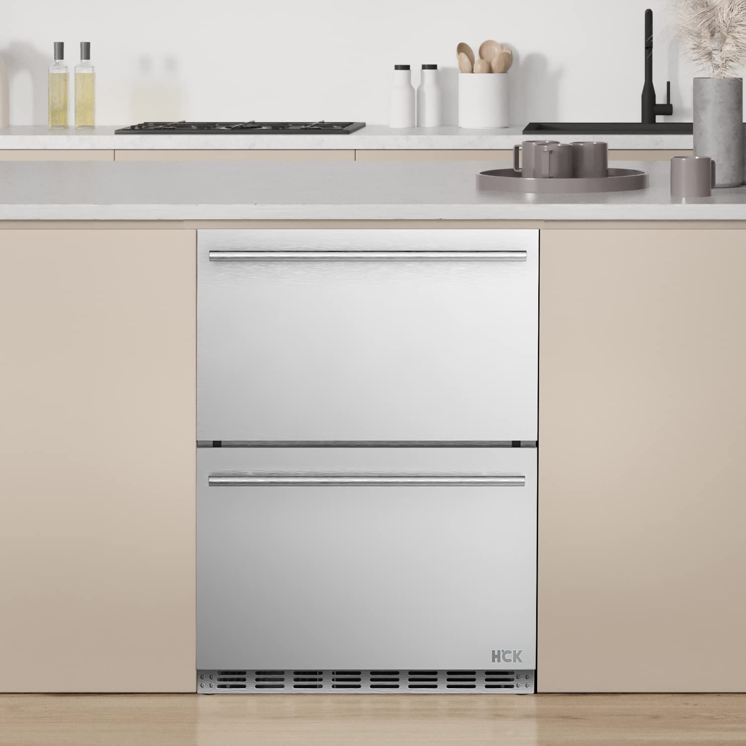 This dual zone refrigerator also features a powerful and highly efficient compressor-based cooling system that uses R600a refrigerant and provides a temperature range from 32°F to 54°F. You can also adjust the temperature setting using the press button controller with blue-colored LED display. Moreover, it's outdoor rated 304 stainless steel construction has IPX4 waterproof rating, so it can withstand any weather and is suitable for both indoor and outdoor, freestanding and under-counter built-in use. Get the HCK 24 inch Dual Zone Refrigerator today for maximum durability and convenience!