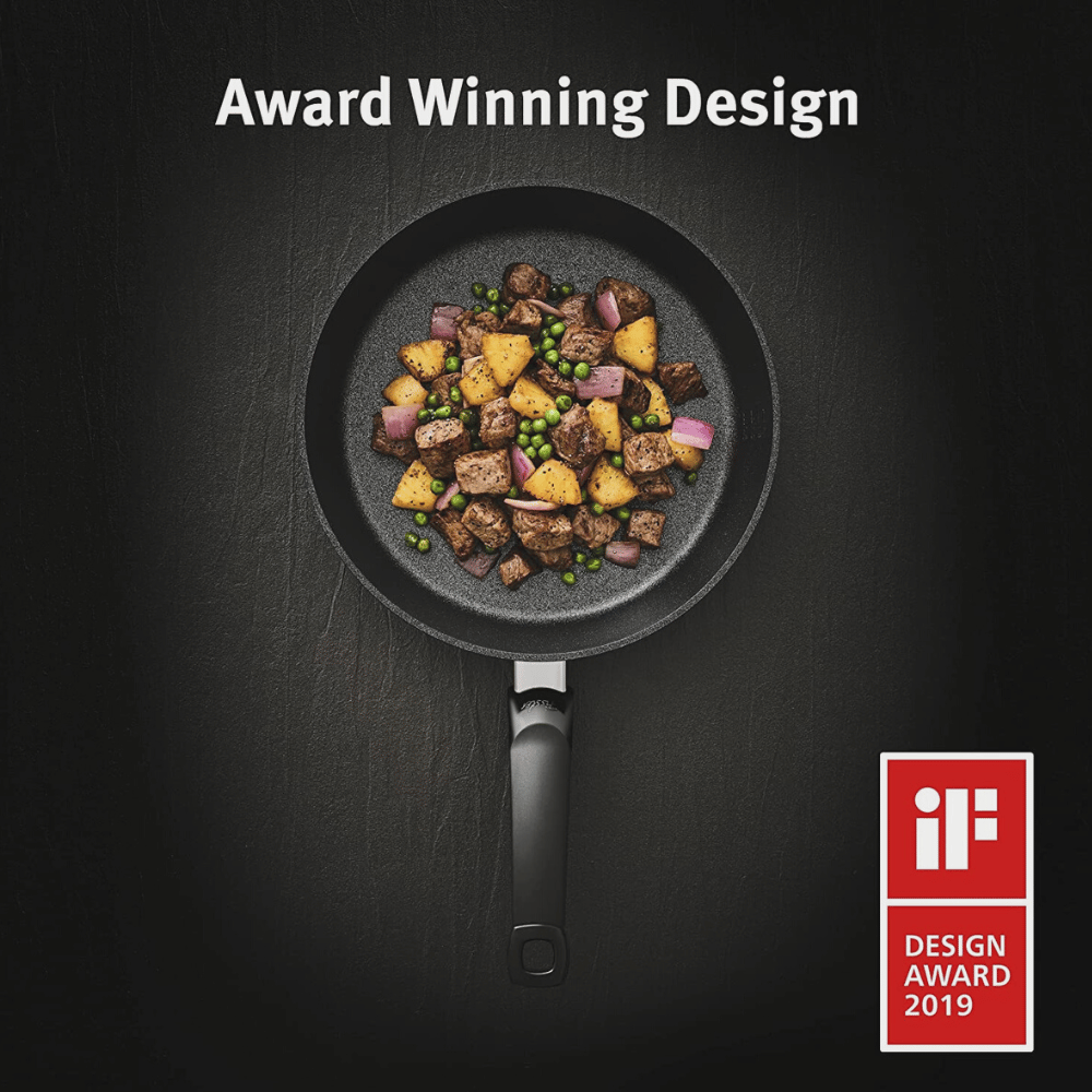 The Fissler Adamant Nonstick Frying Pan also has safety handles with finger shields on its ends, and laser-engraved marks for easy liquid measurement. It's made in Germany with leading technology, craftsmanship, and durable materials, and is a 6th-generation family-owned company offering the right cookware for every taste, dish, and stovetop. Plus, its high rim ensures comfortable stirring and turning without spills.