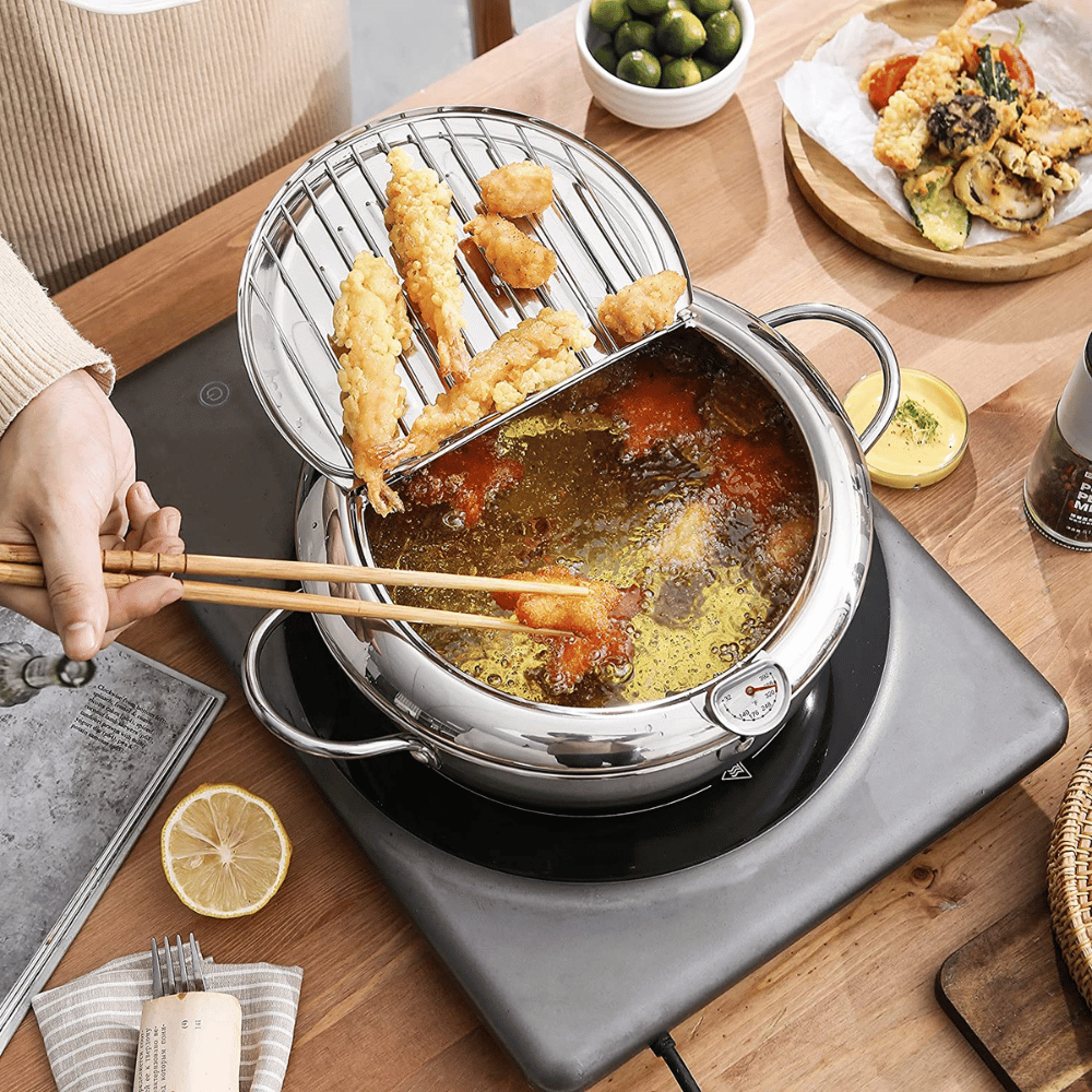 KOMONG Deep Fryer Pot is the perfect tool for deep frying. It is made of durable and safe 304 stainless steel that can withstand high temperatures and hold heat evenly. It also comes with an oil drain rack, V-shaped pot, and insulated handle so you don't need to use an extra dish for draining oil. Plus, it is easy to clean and dishwasher safe.