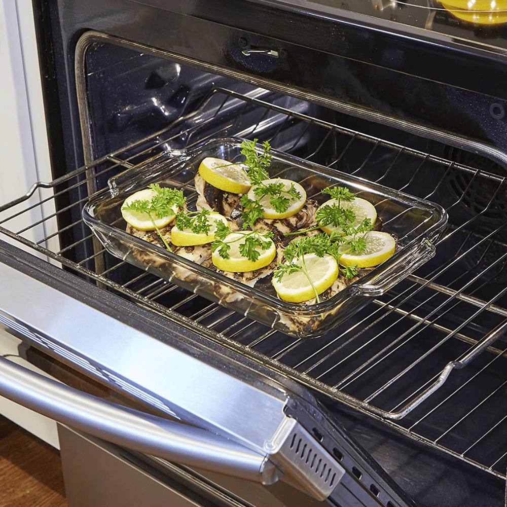 If you’re looking for a classic baking dish to perfectly bake fish, Anchor Hocking Bake Dish is the perfect choice. It has a classic shape that ensures even baking and comfortable, easy grip handles that make it easy to hold and move around. Plus, it’s proudly made in the USA!