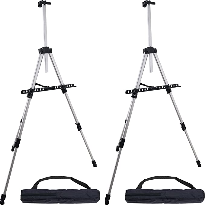 Our 66" Sturdy Silver Aluminum Tripod Artist Field and Display Easel is designed with convenience in mind. This premium quality pack of two Pismo Model silver easels will keep your art, photos, posters, and other materials perfectly displayed with ease. Each lightweight aluminum easel easily collapses down to 18” for quick storage into the shoulder strapped carrying bag so you can take it with you wherever you go. It’s completely adjustable to accommodate items up to 36” in height and 1.2” depth between the self-tightening spring-loaded top clamp – perfect for all kinds of projects!