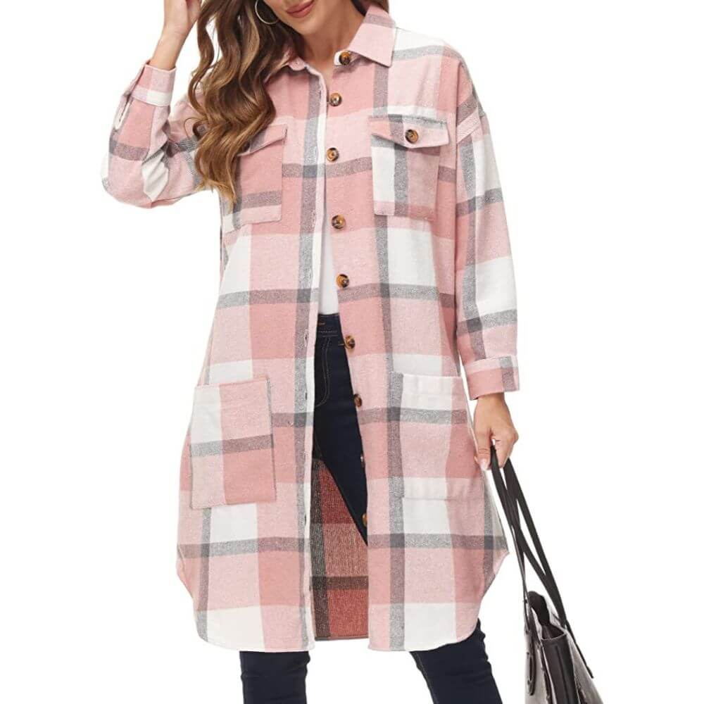 This trendy longer length piece features a loose fit, classic plaid pattern, turndown collar, two flap chest pockets, two front pockets and button down closure. It also has a curved hem, making it perfect for layering.