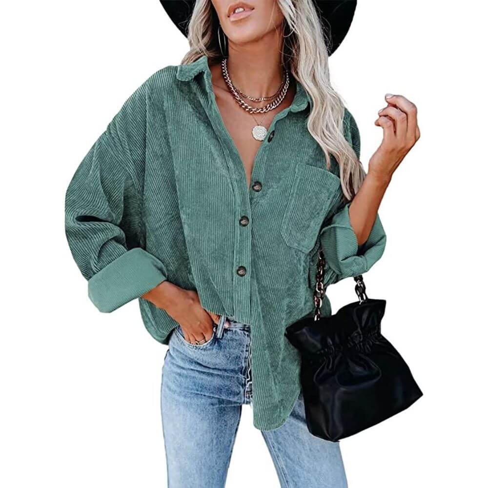 It features a soft, lightweight and comfortable corduroy fabric with a ton of colors and prints to choose from. It has a plaid print, button down closure, chest pockets, and long sleeves with a boyfriend style and turn-down collar.