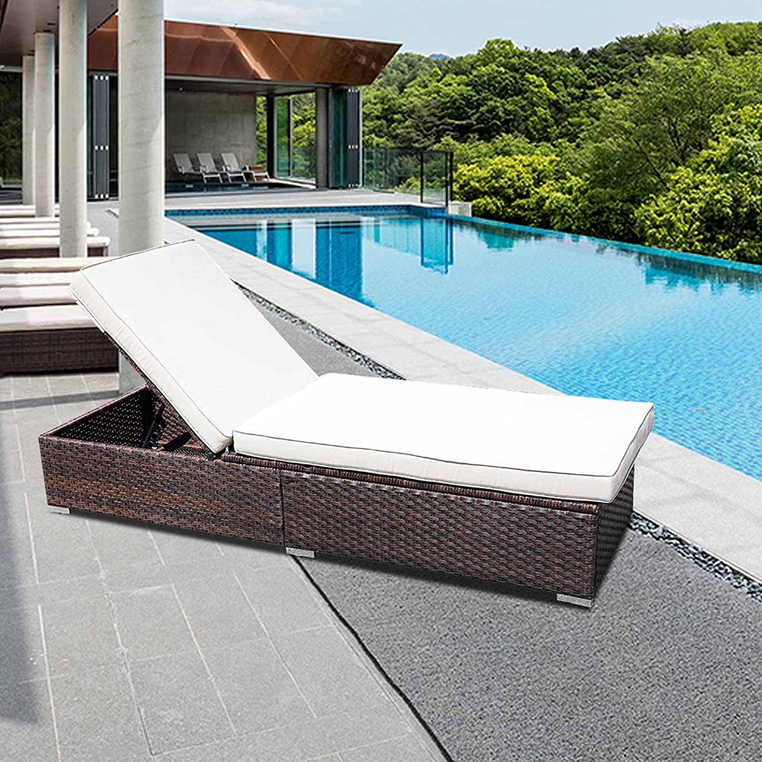 Outdoor PE Wicker Chaise Lounge is the perfect way to relax and unwind in your backyard or patio. Constructed from a rust-resistant steel frame and all-weather PE rattan, it is strong, durable and sturdy for years of use. The cushions are filled with 2.3” thick high resilience sponge for superior comfort, and the cushion covers are made from 250G polyester water repellent and UV-resistant fabric. The adjustable back of this recliner has 5 reclining positions, so you can find the perfect angle to lounge. Plus, the side table offers extra space for magazines or drinks and more.