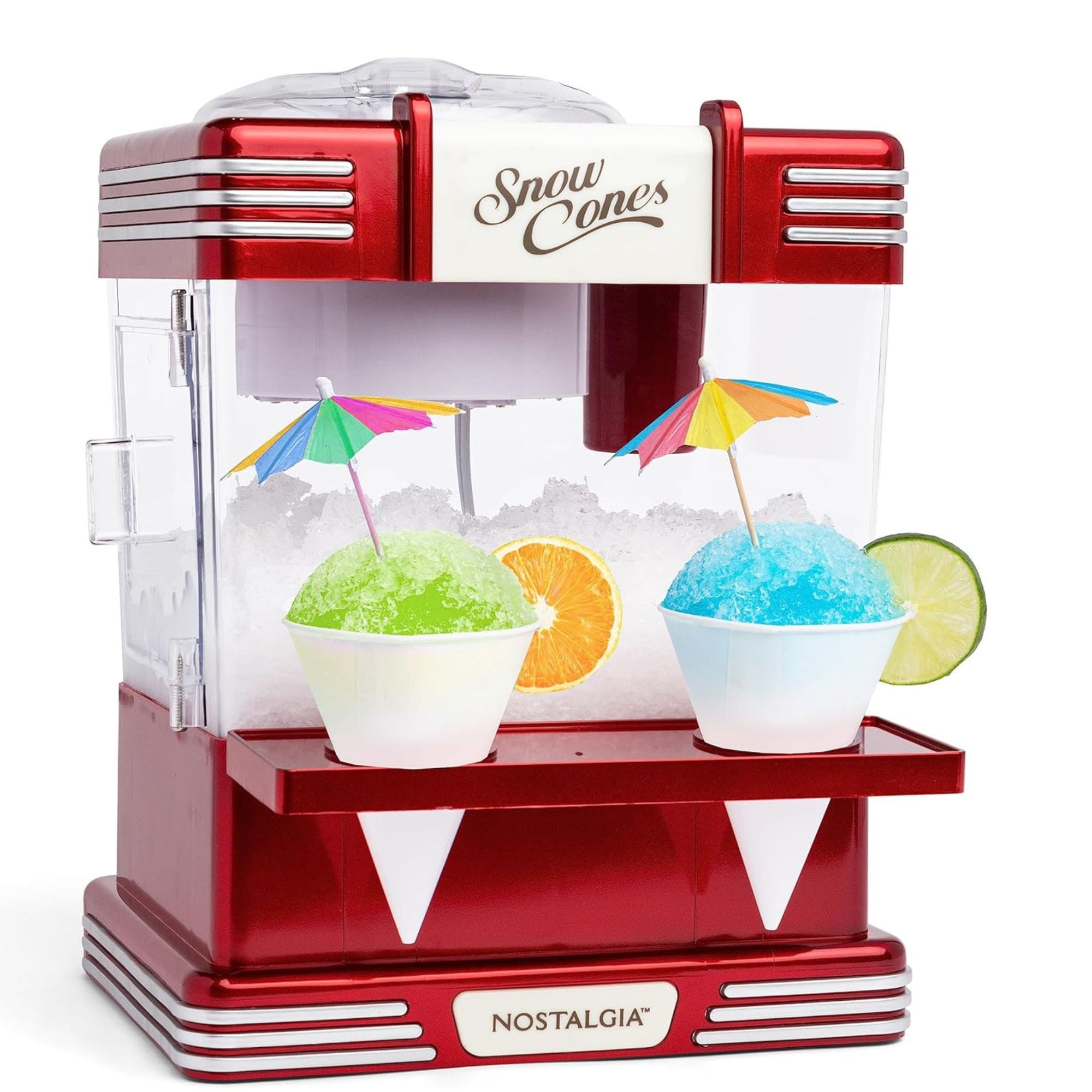 The Nostalgia retro kitchen ice machine is perfect for creating classic snow cones and refreshing slushies at home. It works with all Nostalgia snow cone kits and features precision-cut stainless steel blades that quickly and efficiently shave ice. The mixing function allows you to create the perfect way for your icy treats.