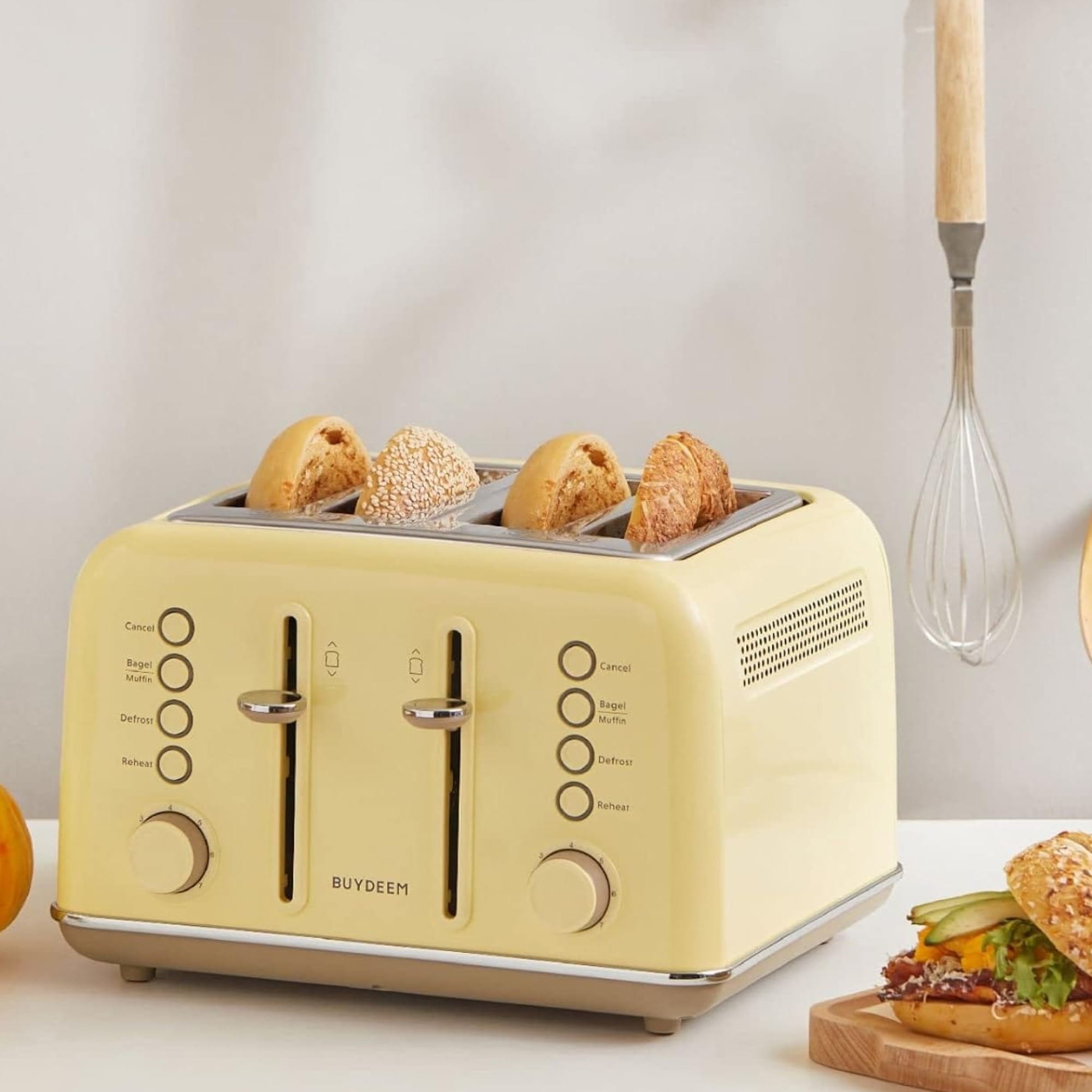 The Buydeem 4-Slice Toaster Retro Kitchen Appliance is both practical and convenient, with cooking power and modern performance that delivers perfectly toasted bread every time. It has dual independent control panels and a solid high-lift lever for easy toast removal. Its compact and retro design saves space on your countertop.