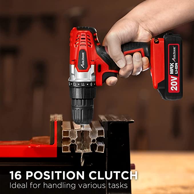 The AVID POWER 20V MAX Lithium Ion Cordless Drill is the perfect power drill set for any DIY job. It features a 20V 1.5Ah Lithium-ion battery pack with USB output compatible for phone charging and a real-time capacity indicator.