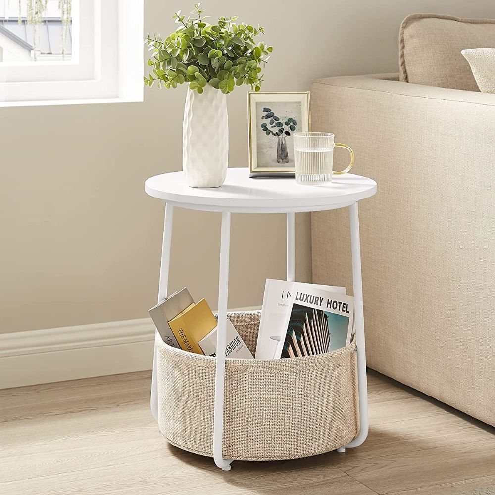 Vasagle Round Modern Nightstand's simple yet elegant design will match with any decor. It's also made with a strong and sway free steel frame and U-shaped legs, which are attached to the top frame for extra stability. Plus, it has a double-layer fabric basket that provides ample storage space for all your bedside essentials.