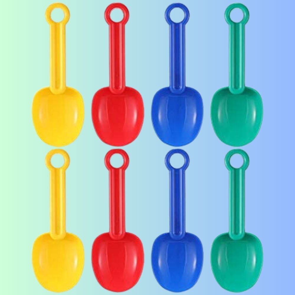 The 8-piece set comes with 2 shovels in each of the 4 colors: green, yellow, red, and blue. Each shovel is 8.5” long and the edges are rounded and safe, making it a great gift for your toddler or kid.