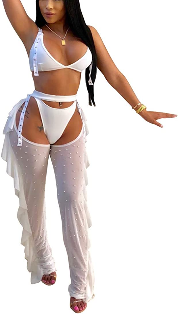 We love the see-through clothing because it is made of Polyester and mesh, which is soft and comfortable to wear. It features a v-neck top with beading pearls, a sleeveless design, long-side ruffle mesh pants, and a hollow-out design. The outfit is perfect for any beach party or special occasion, perfect for showing off your curves.