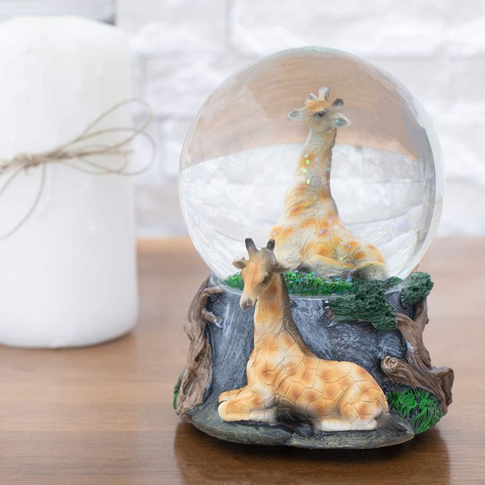The figurine inside the globe depicts a Giraffe relaxing on the plains, adding a touch of whimsy and fun to your home accents.