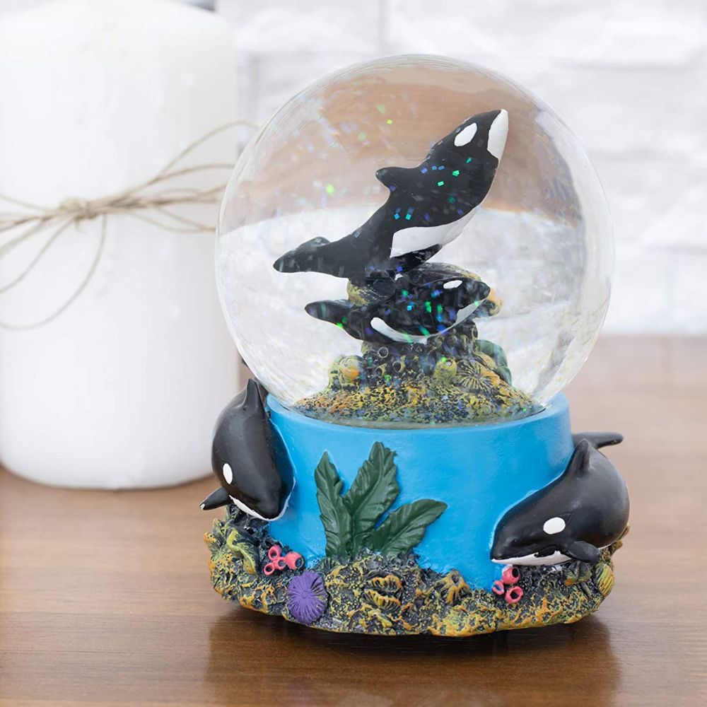 The base is made of a resin polymer stone material with dimensional Orca figurines, and the globe is filled with metallic glitter that swirls around the Orca pod when you shake it.